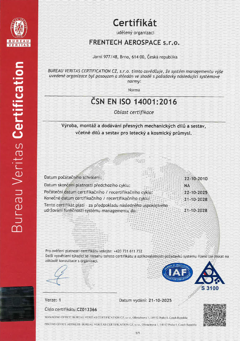 Certifikace Společnost Frentech Aerospace s.r.o. je držitelem těchto certifikátů: ISO9001 AS9100D ISO-14001 AP5270 ECSS-Q-ST-70-05C ECSS-Q-ST-70-05C